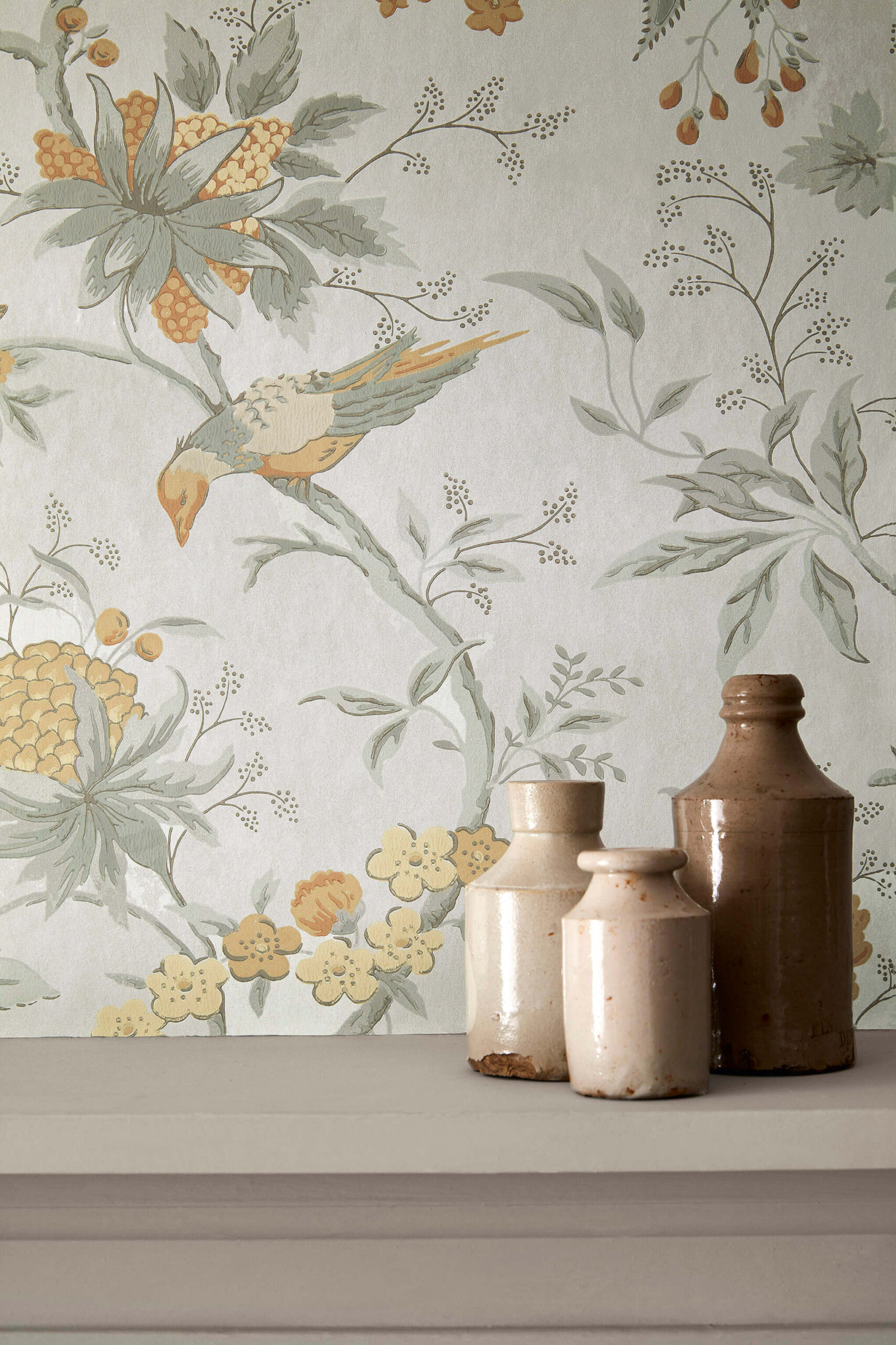 Found at Brooke House in Hackney, the document from which this pattern was drawn is identified as 1920s in origin, notably because of the way it had been printed: a ‘gravure’ technique, which only became commercially viable after the turn of the last century. In fact, the design is likely to have been copied from a much earlier paper and the five colourways have been made using the rather more painterly, textural surface print technique which is more typical of the older, original wallpaper.